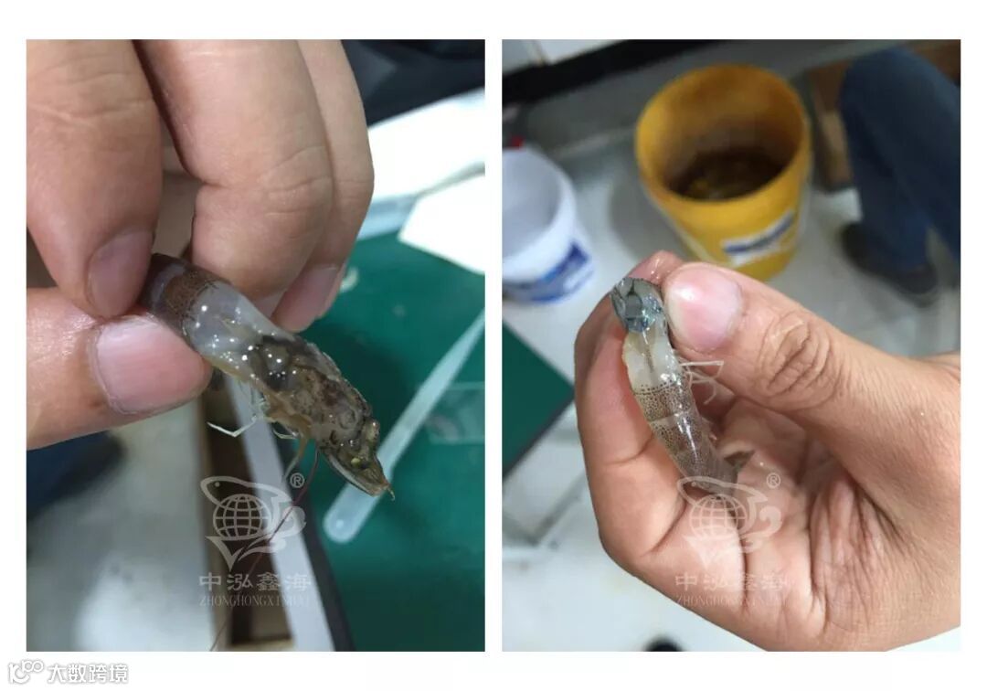 体质弱、个体小、甲壳脆、体色暗。鳃丝稍肿,鳃盖上布满许多黑色和蓝色斑点。空胃或残胃,肝脏萎缩呈淡蓝色,不易碎,弹性较大,后期变白,开始萎缩糜烂,往往伴有黑鳃病、纤毛虫病和肌肉白浊病。