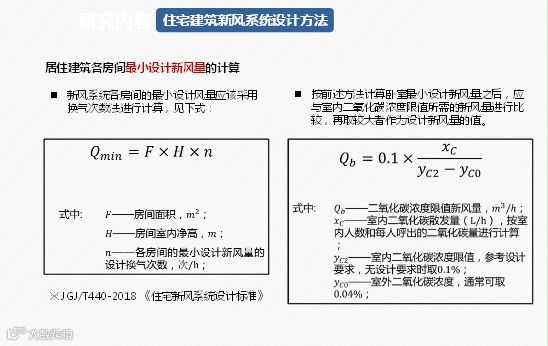 首先是居住建筑各房间最小设计新风量的计算。大家都知道,标准给的都是最小新风量,因为要考虑节能,所以需要有一个最小新风量,而下图就是相应风量的计算方法。