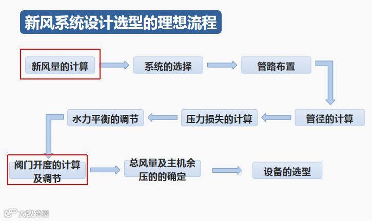 这是一个理想流程:按照现在正规的设计步骤,先是要进行新风量的需求计算,然后去选择系统,之后再结合建筑图纸,进行管路布置设计,然后进行管径的计算,接下来去计算输配体系的压力损失是多少,接着是怎样去做水力平衡调节,然后选择用阀门或某种装置,最初要设计它的开度(如果想做到不去调试,这些需要在设计阶段就全部想好,安装的时候就计算出阀的开度,把它调好,安装上去就可以了),接下来进行总风量及主机余压的确定,最后选择相对应的主机。
