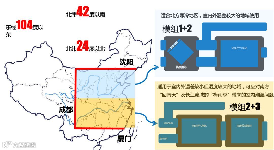 每一个设备都是有边界的,我们自己做了这么多数据分析下来,发现我们自己的净化新风系统边界是这样的,大概在成都以东,厦门北纬20度以北,沈阳北纬20度以南。南方我们是用净化功能+除湿功能,因为南方的除湿需求远大于节能需求。所需设备是这样的,三个模块,中间是一个主机,前面是一个交换模块,后面是一个湿度控制模块。