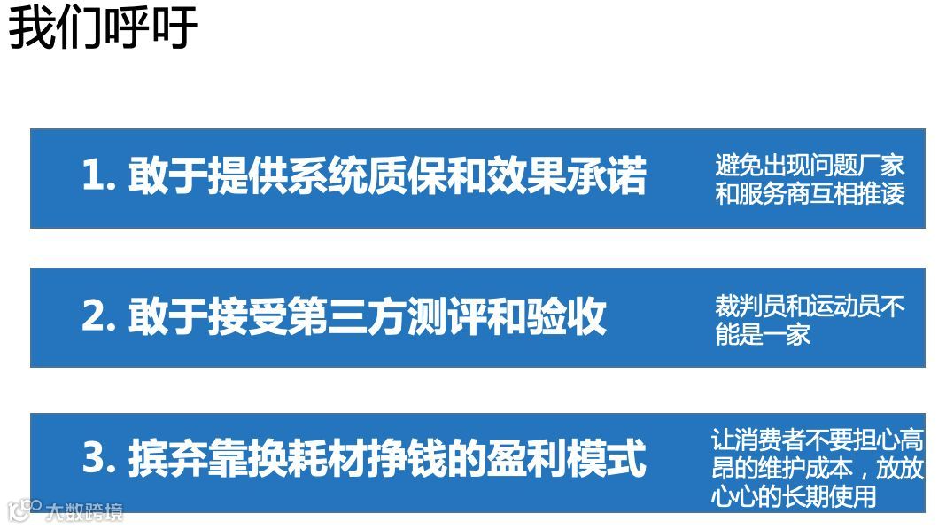 第一,希望我们的厂家都敢提供系统质保和效果承诺,避免出现问题厂家和服务商互相推诿。新风是一个系统,我们一定要从系统的角度提高质保。第二,敢于接受第三方测评和验收。裁判员和运动员不能是一家,新风行业不能让服务商自己说装得好就装得好。第三,摈弃靠耗材挣钱的盈利模式。让消费者不要担心高昂的维护成本,放心的长期使用。