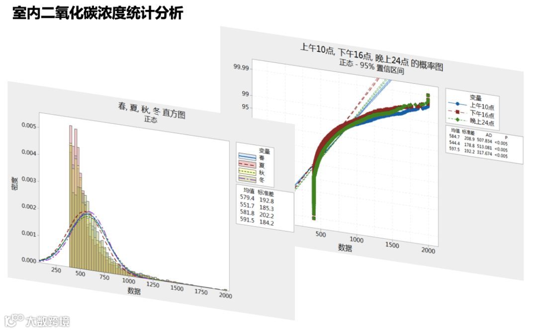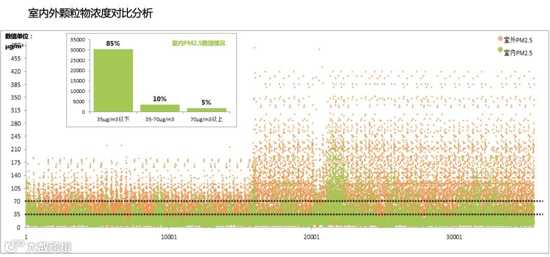 先来看一下室内外颗粒物浓度对比分析图,这里的每个点就是一个测试取样点,一共有多少个测试点呢,非常多,有35500个点。除了这个以外,我们还有分南方、北方不同的地域,分上午、中午、下午不同时间段的二氧化碳浓度统计分析。但是甲醛浓度取样分析没有用到这样的在线数据分析,因为普通的传感器非常不准确。
