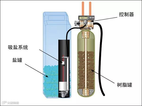 软水机通过离子交换树脂中的钠离子交换硬水中的钙、镁离子,从而降低水质硬度。