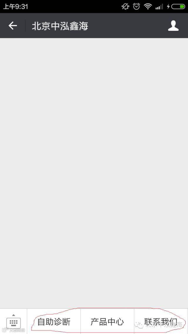 进入“北京中泓鑫海”公众号之后,底部出现三个功能菜单,分别为自助诊断、产品中心和联系方式,如图