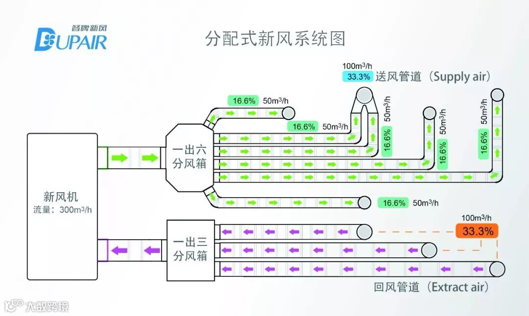 确认好末端需求新风量之后,我们就要进行支路管道的布局以及管径的选择。如果是主路管道分布式设计,还需要进行水力计算找出最不利环路进行修改。规程中都有比较明确地规定管道搭配方式,要求每路都要安装调节阀等,由于篇幅有限,我不在此一一列举。如果采取分风箱+PE管道相对容易处理,将流量分为若干份,根据末端需求进行组合,这种处理方式更能体现定量的思想,也会成为未来新风系统的主流选择。