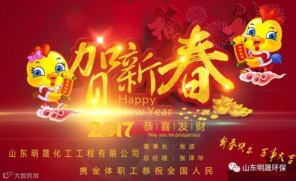 岁月不居,天道酬勤2016年度明晟环保在广大客户和社会各界人士的信任与支持下圆满完成年度工作,为社会交上了一份满意的答卷。值此新春佳节到来之际,公司董事长张波、总经理张泽华携公司全体干部职工,恭贺社会各界朋友新春快乐,万事大吉!