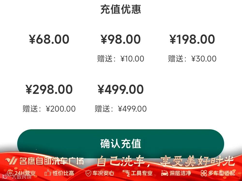 传统洗车单次 30-50 元,名鹰自助洗车价格更实惠,还推出 68、98、198、298、499 元阶梯储值套餐,其中298 元送 200 元享 6 折,499 元送 499 元享 5 折,钜惠力度十足。