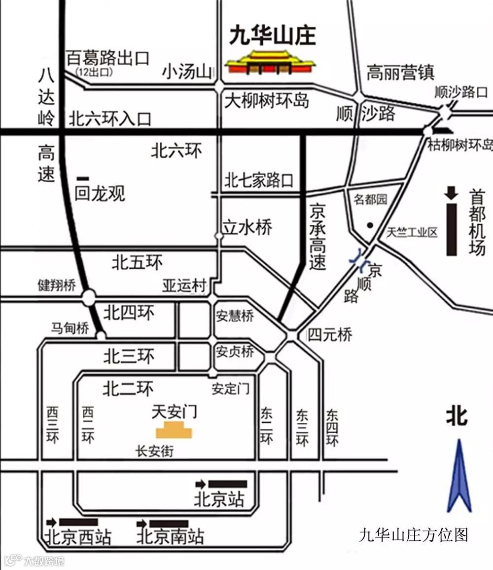 2.走京承高速,到北六环往昌平方向,见到安四路(北苑、小汤山)出口出,然后右拐,丁字口左拐,第二个十字路口右拐200米路左即到九华山庄。