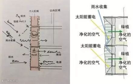 这个初启单元能直接外挂在阳台上,可以用光伏发电,自带空调集成系统。外面包了一层可吸收pm2.5粉尘的新型材料,能收集雨水收集,用于浇花和生活用水。
