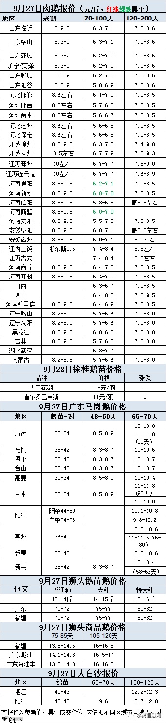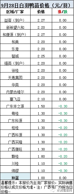 一、2020年9月28日白羽鸭苗报价;