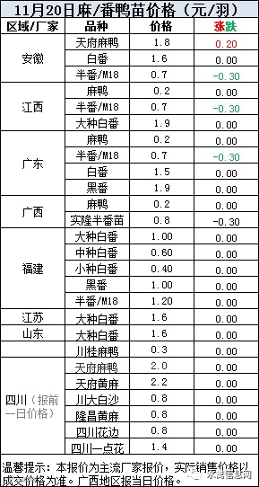 受白鸭下调影响,今晚麻鸭/半番报价整体弱势下调。