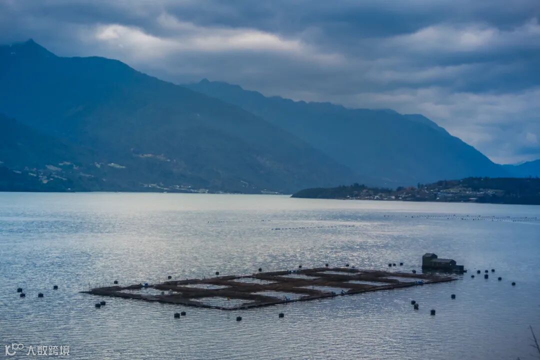 智利洛斯拉各斯科查莫湾的鲑鱼养殖场
