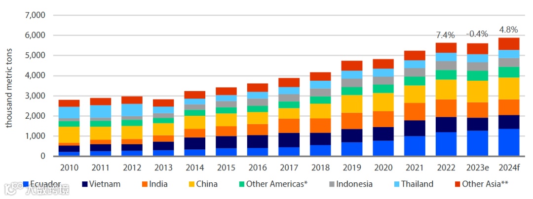 该报告预测,虾类明年将恢复增长,尽管增速低于 10 年历史平均水平。调查结果预测,2024年虾类产量同比增长4.8%,超过2022年产量峰值,预计2023年小幅下降0.4%。但在厄瓜多尔,2024年产量增长预计将放缓。