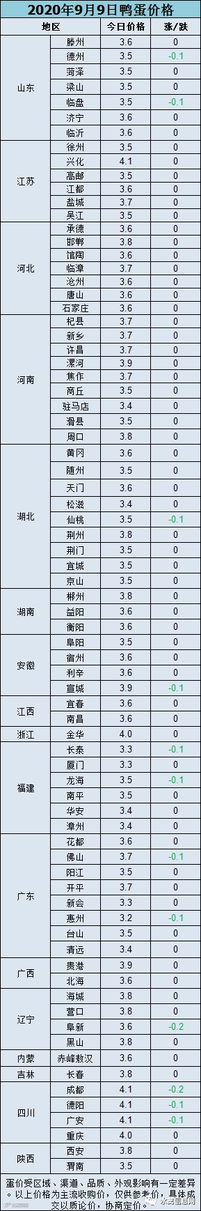 【鸭蛋价格】2020年9月9日鸭蛋报价,弱势探底。
