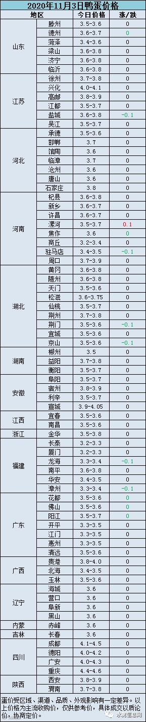 今日蛋价综述:今日鸭蛋市场报价持续下滑。低价区均价3.3元/斤,高价区均价3.6元/斤。