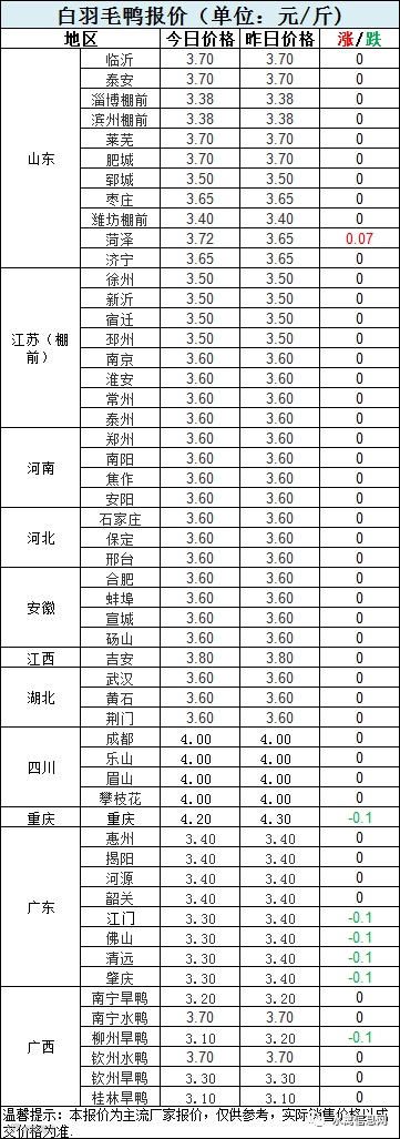 1:今晚北方分割鸭区域报价稳定为主,局部涨跌调整。北方市场以合同鸭为主,毛鸭价格受冷藏成本与冻品价格影响,涨跌幅度有限,基本小幅波动中。