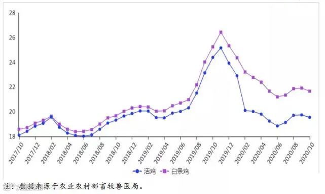10月份,受前期产能扩张影响,禽肉供应充足,在双节因素影响短暂上涨后,禽肉价格持续下跌。10月份,受前期养殖规模扩张和进口增加影响,禽肉供给相对充足,生猪生产快速恢复,替代消费减少,禽肉价格呈现回落走势。