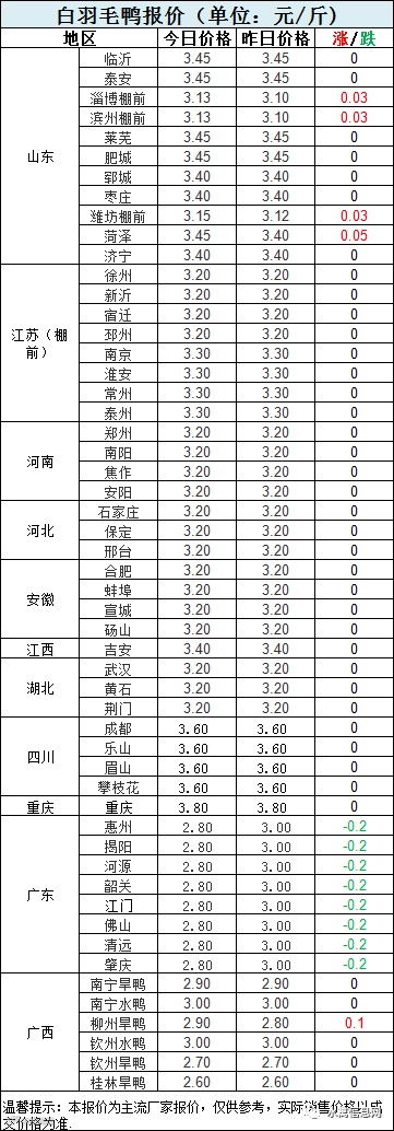 明日北方苗价报稳,苗价进入拉锯博弈阶段,波动调整。受毛鸭与冻品低迷影响,鸭苗后续上涨阻力加大。南方鸭苗外调较多,主要看南北差价调整价位。
