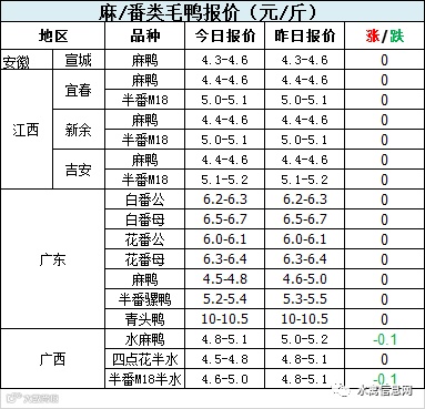 两广活禽连续下滑,养殖端深度亏损。受白鸭下滑影响,今晚麻鸭半番鸭报价持续弱势。