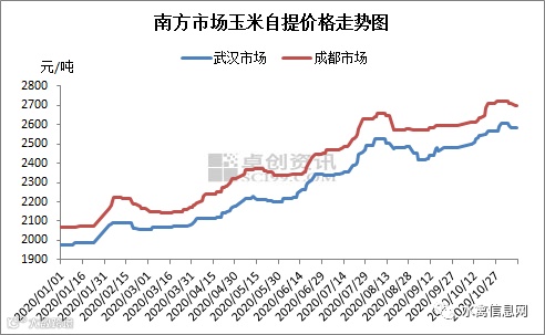 以具体市场为例,截止到11月10日,湖北武汉港口玉米自提价格2610元/吨,二等陈粮,较月初价格高点回落40元/吨。四川地区东北玉米到站价格2740元/吨,较月初下降60元/吨。