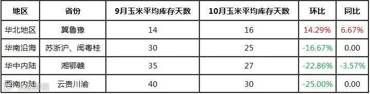 目前饲料企业仍以按需采购陈粮为主,地区内贸易商接货谨慎,目前以出货为主,市场成交延续清淡,观望意向较强。从下游饲料企业的库存水平来看,根据卓创资讯监测,截至10月30日,国内中大型饲料企业库存在16-20天,库存水平环比下降。目前饲料企业多维持安全库存,后续补库备货的潜在需求较强。