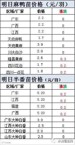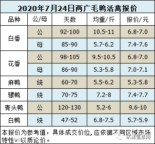 明日7月25号,樱桃谷鸭苗回暖上调,除广西稳定外,全国主流大厂报价上调0.1-0.2元/羽不等。麻鸭/半番鸭苗继续报涨0.1-0.2元/羽不等。【详细报价请查看下方表格】