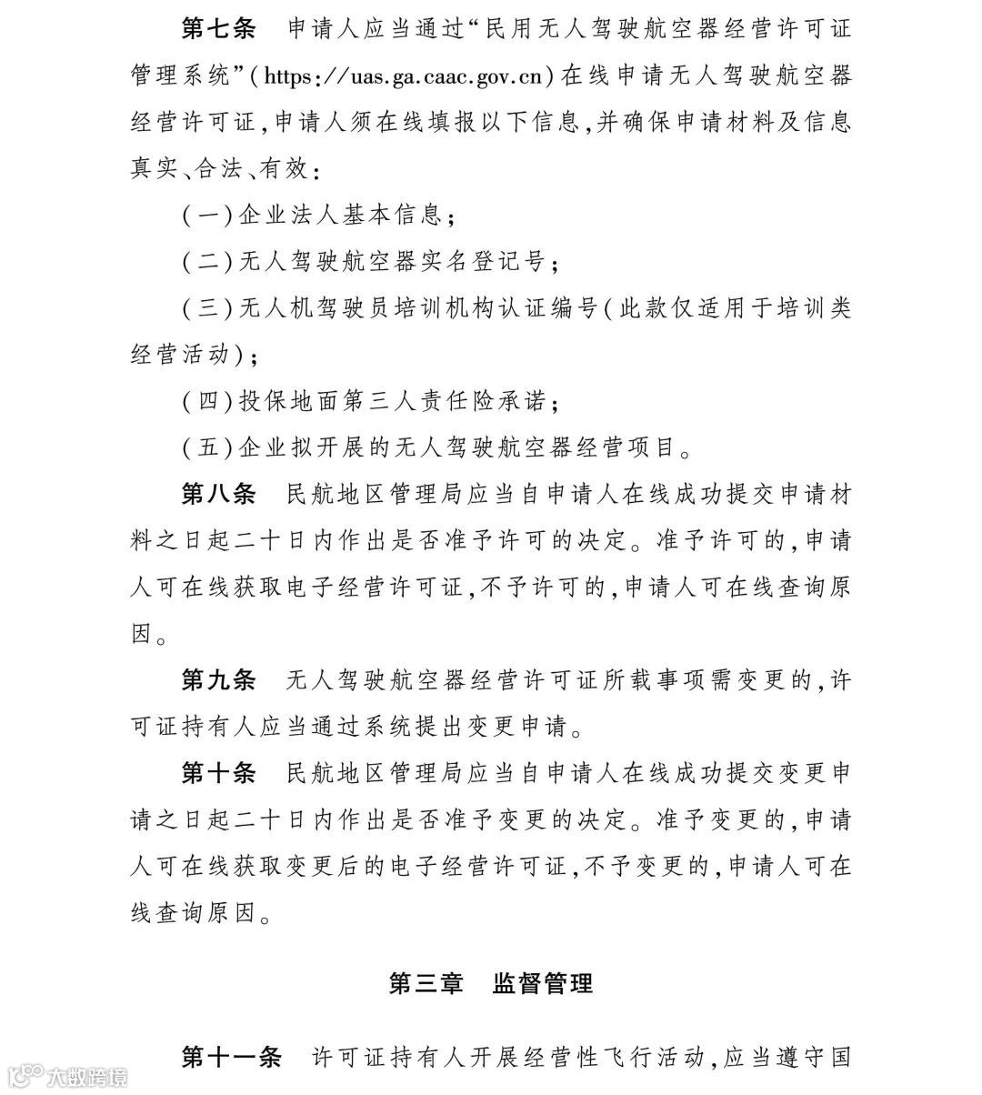 《办法》明确,民航局对无人驾驶航空器经营许可证实施统一监督管理,民航地区管理局负责实施辖区内的无人驾驶航空器经营许可证颁发及监管管理工作。