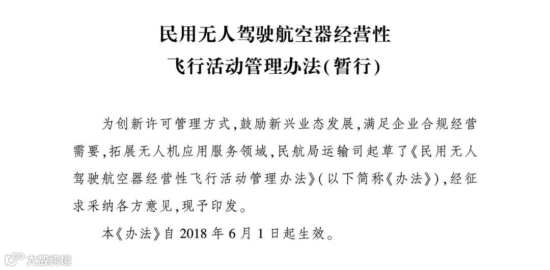 如今,这个困扰了无人机经营活动企业与创业者多年的问题终于可以得到解决。后天,也就是6月1日起,民航局发布《民用无人驾驶航空器经营性飞行活动管理办法(暂行)》(以下简称《办法》)正式开始实施。《办法》对无人驾驶航空器运营商如何取得经营许可证等诸多问题进行了明确,企业从事经营性飞行活动将从此合法合规。