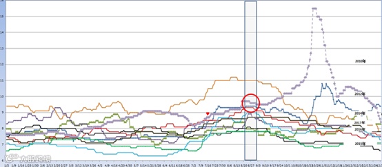 上图是近十年来,中大白条鸭平均价格走势图。从图上可以看出,每年从7月中旬到8月下旬之间才是白条鸭真正开始呈现上涨的稳行情,几乎年年都不会例外,只是绝对值高低的问题。