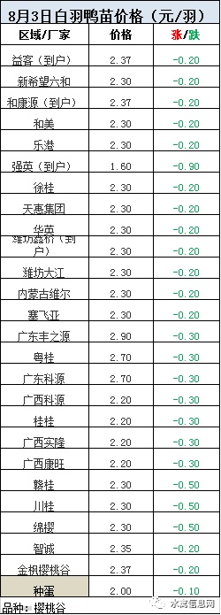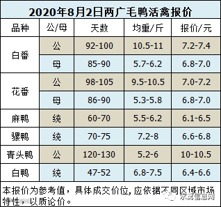 2020年8月2日晚至3日毛鸭报价