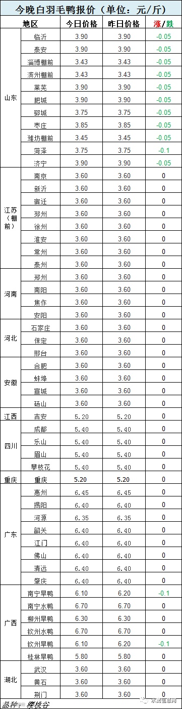 今晚樱桃谷毛鸭报价,山东下调0.05-0.1元/斤,苏、豫、翼、皖暂稳观望。南方活禽两广局部继续高位下滑调整。【详细报价请查看下方表格】