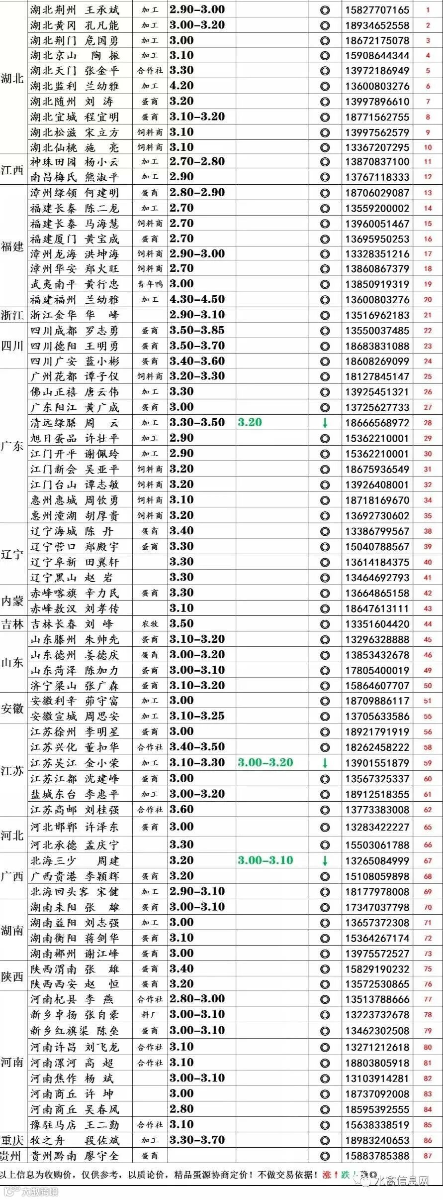 | 蛋价受蛋形、蛋重、整洁度影响,以上价格为参考,具体成交以质论价,协商定价。 |