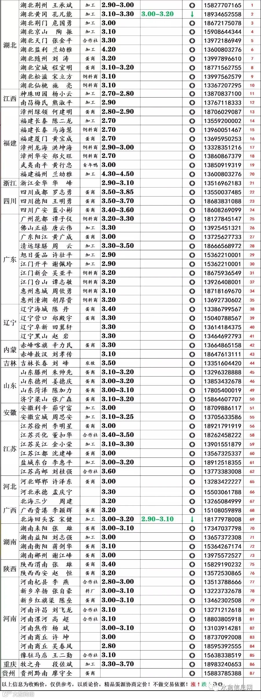 | 蛋价受蛋形、蛋重、整洁度影响,以上价格为参考,具体成交以质论价,协商定价。 |