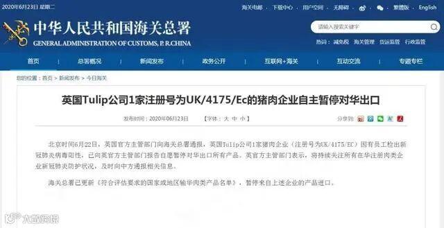 6月23日,中国海关公告,北京时间6月22日,英国官方主管部门向海关总署通报,英国Tulip公司1家猪肉企业(注册号为UK/4175/EC)因有员工检出新冠肺炎病毒阳性,已向英官方主管部门报告自愿暂停对华出口所有产品。