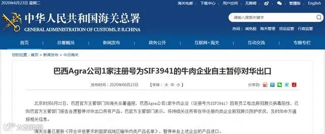 6月22日,巴西官方主管部门向海关总署通报,巴西Agra公司1家牛肉企业(注册号为SIF3941)因有员工检出新冠肺炎病毒阳性,已向巴官方主管部门报告自愿暂停对华出口所有产品。