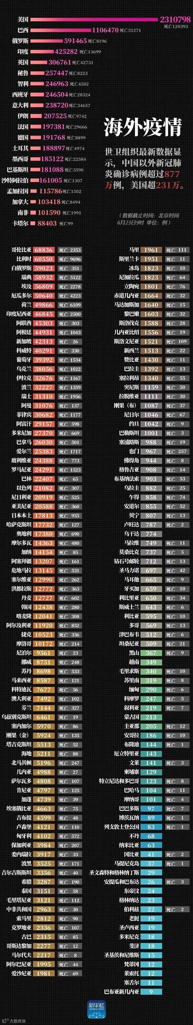 根据世卫组织最新数据显示,截至北京时间6月23日9时,美国确诊人数超231万例,巴西确诊人数超110万例,全球确诊人数超910万例。