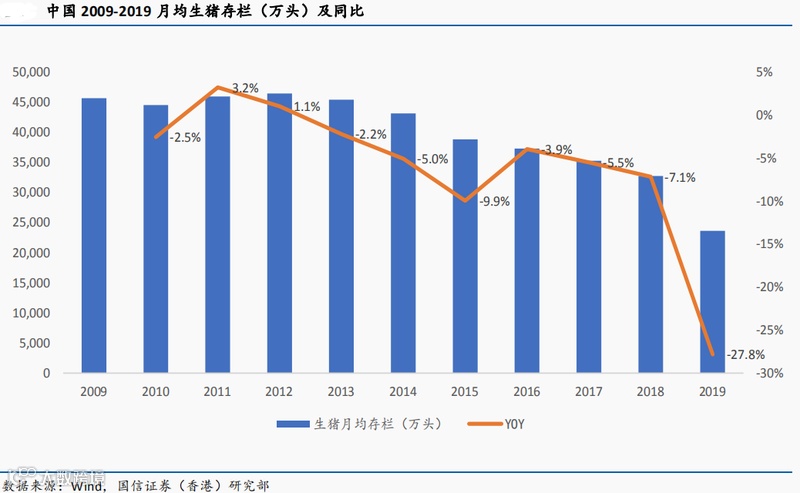 据了解,我国猪肉供应仍处在偏紧状态,能繁母猪及生猪存栏恢复缓慢,离非洲猪瘟蔓延前水平仍有较大距离:生猪存栏量从2015年开始见到非常明显的下跌,2018年8月份,中国部分省份开始发生非洲猪瘟,生猪存栏锐减,2019年月均生猪存栏量同比大跌27%。