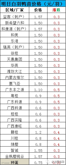 南方鸭苗也在北苗拉升的带动下,久违的报价跟涨,明日13号南方主流厂家报价均上调0.3-0.5元/羽不等。连续亏损的养殖户,现在依然面临着成鸭交易困难及亏损,投苗积极性并不高,到底能不能买鸭苗上涨的账还有待观察。