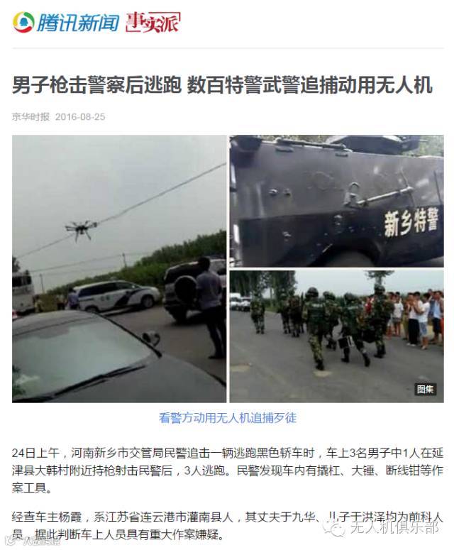 市交管局民警追击一辆有重大作案嫌疑的逃跑黑色轿车时,车上3名男子中1人在延津县大韩村附近持枪射击民警后,3人逃入路边玉米地,当地警方正开展搜寻工作。目击者称,307国道大韩村附近几公里均被封锁。现场有至少30多辆警车,数百名特警、武警戒备。“玉米地旁边有持枪特警带着警犬搜寻,并出动警用无人机进行追击”。