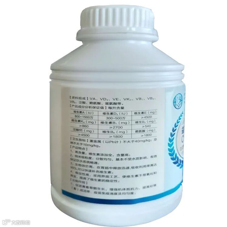 维生素D3每升含量300-500万IU:促进肠内钙磷的吸收和沉积,对肿瘤病的预防和治疗有积极作用。