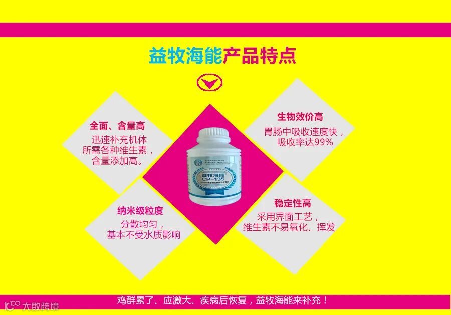 知道了目前鸡鸭养殖过程中,存在着各种应激问题和市场上的多维多是低价、低含量,并不能很好的解决鸡鸭应激、抗病力和催肥促进生长的问题,家禽信息PIB产品部门,从设计多维配方,选购多维原料、到特殊工艺加工多维,再到实际应用到鸡鸭养殖现场,前后花了近2年的时间,今天,终于上线了这款高含量液体维生素——益牧海能。