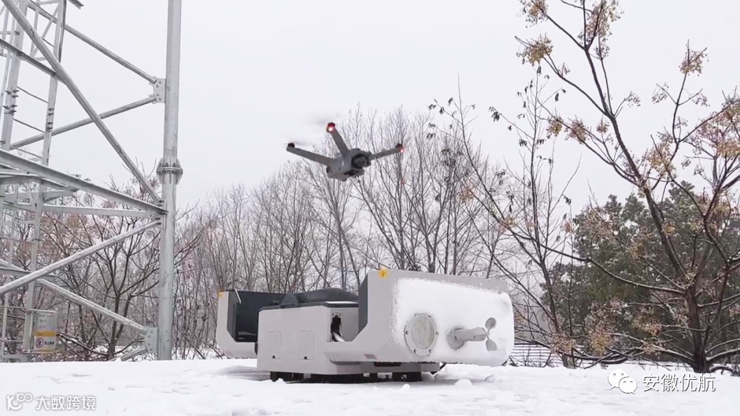 另一边,安徽优航技术人员正在凛冽寒风中争分夺秒进行无人机机场最后的调试。机场不日就将正式交付,作为覆冰观测站承担覆冰预警监测的重任。当冬季道路积雪结冰,巡视人员难以快速抵达现场时,便可通过机场出动无人机作为“千里眼”,及时获取现场信息,节约恶劣天气和地形下的巡视时间,大大提升巡视效率,降低巡检风险。