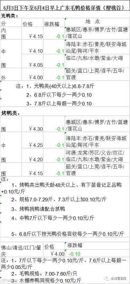 | 2020年6月3日两广毛鸭活禽报价 | ||||
