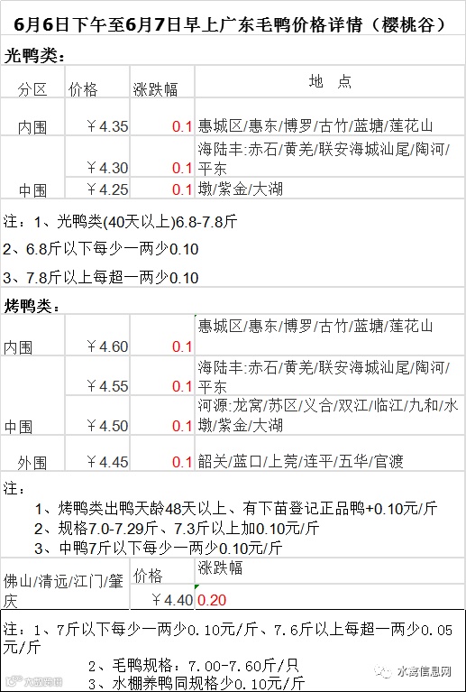 明日6月7号,全国樱桃谷鸭苗报价持续前一日态势,粤、赣稳定,其他区域继续上涨0.1元/羽。