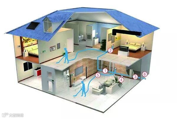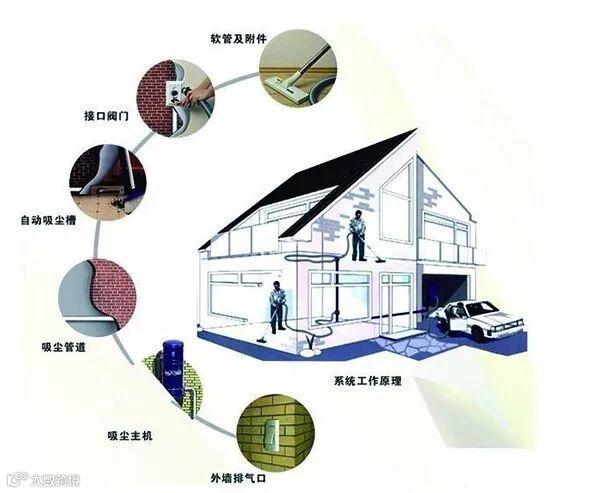 中央除尘系统用PVC管道网络,将吸尘管道配置在房屋地板或墙面上的自动接口,与安装在生活区域之外的工作主机相连接,当除尘器软管被插入一个接口系统就会自动开始工作,灰尘和碎片都会被吸附,并被排放到生活区域之外。
