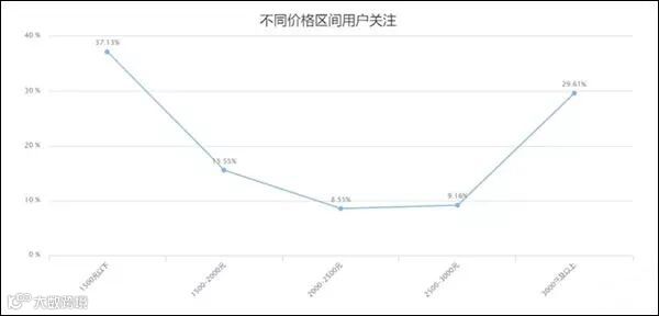 从下方的折线图的价格区间走势可以看出,1500元以下价格段为主要关注焦点,用户普遍集中,占比达到37.13%,其他价格段中3000元及以上(29.61%),1500~2000元(15.55%),人气也相对较高。