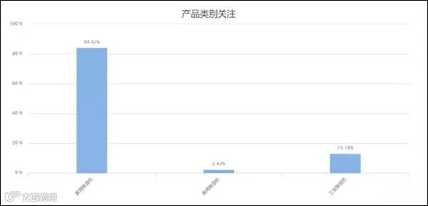 用户购机在产品使用类别方面最为看重或考虑的是:家用除湿机(84.42%)、工业除湿机(13.1%)、商用除湿机也有一定比例的用户关注度。