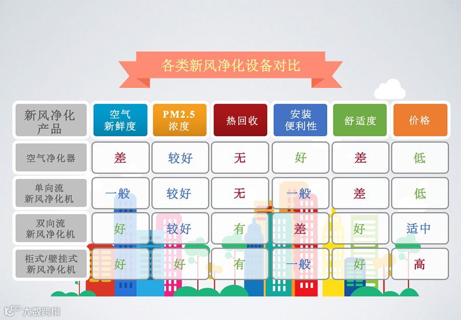 面对市面上一系列的新风设备,我们应该怎么选择?我们对它做了一个简单的分类,由最简单的新风净化产品、空气净化器,一直到单向流、双向流等新风系统,整体上有了一个改善。