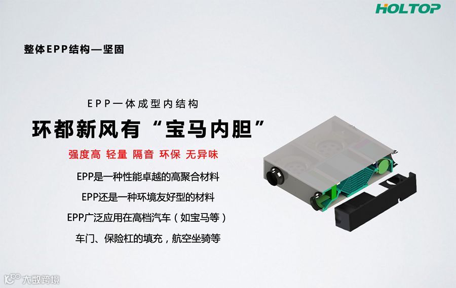 第二点,EPP的大规模应用。EPP硬度很高,在设备里面一次成型,不是简单的局部构件,整体是EPP材质。一般这种新风设备有几个很重要的指标和内部结构是息息相关的,包括过滤器的过滤效率、整机效率、结构的密封性等。EPP一般用于汽车的车膜制作,隔热性能很好。