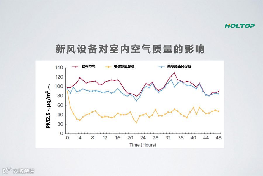 到底空气污染对我们人体有何影响?这是今年四月份苏宁做新品发布会时透露的一个数据,引用当时钟南山院士发表演讲的数据,红色代表室外空气,在未安装新风系统的时候室内的污染物(我们统计的是PM2.5)与室外是一样的,但装了新风系统后,随着时间的变化,其净化效果还是比较明显的。在2019年环都可能会跟苏宁达成一个战略合作,主推新风新产品。